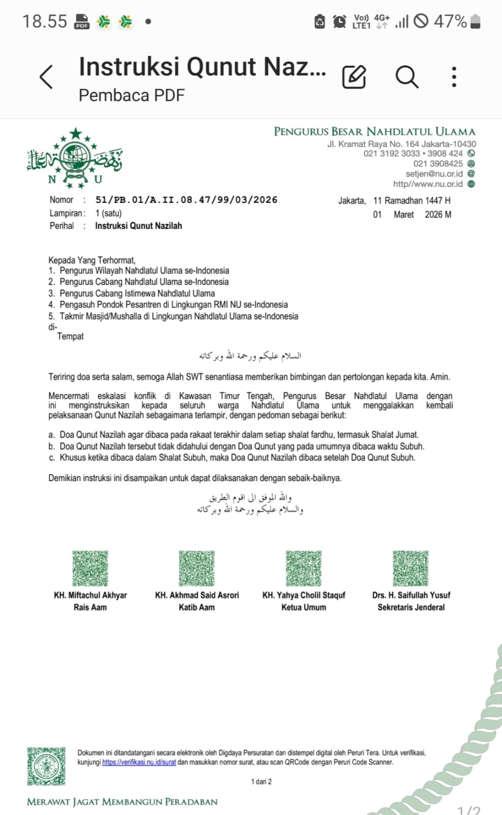 Surat instruksi tersebut ditandatangani oleh Rais Aam PBNU Miftachul Akhyar, Katib Aam PBNU Akhmad Said Asrori, Ketua Umum PBNU Yahya Cholil Staquf, serta Sekretaris Jenderal PBNU Saifullah Yusuf.