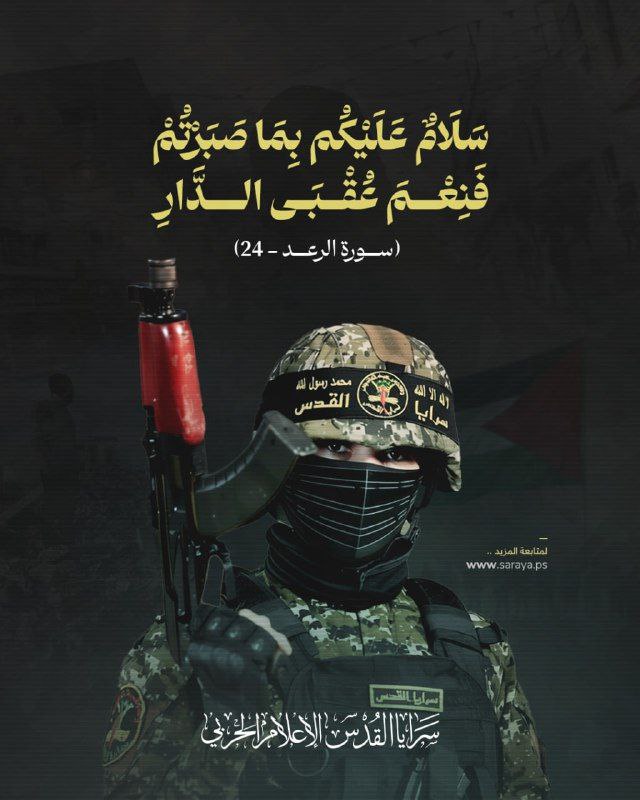 Saraya Al-Quds mempublikasikan ayat Al-Qur’an: “Salam sejahtera atas kalian karena kesabaran kalian, maka sungguh baiklah akhirnya tempat kembali itu”