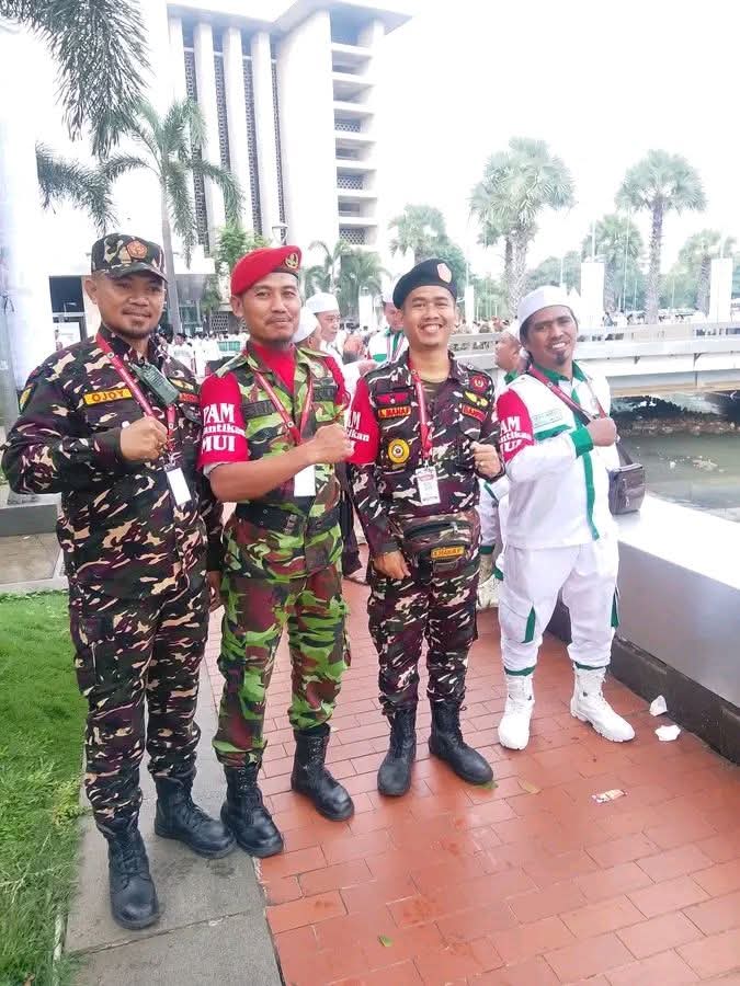 Tampak para pengawal dan unsur keamanan dari Banser Nahdlatul Ulama, KOKAM Muhammadiyah, Front Persaudaraan Islam (FPI), serta Forum Betawi Rempug (FBR) bahu-membahu menjaga ketertiban dan keamanan acara berskala nasional tersebut.